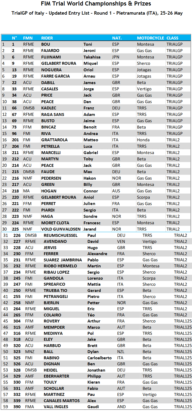 Il Trial125 si presenta come una categoria molto aperta, dove avremo tre piloti spagnoli: Pau Martínez, Pol Medinya e Alex Canales.