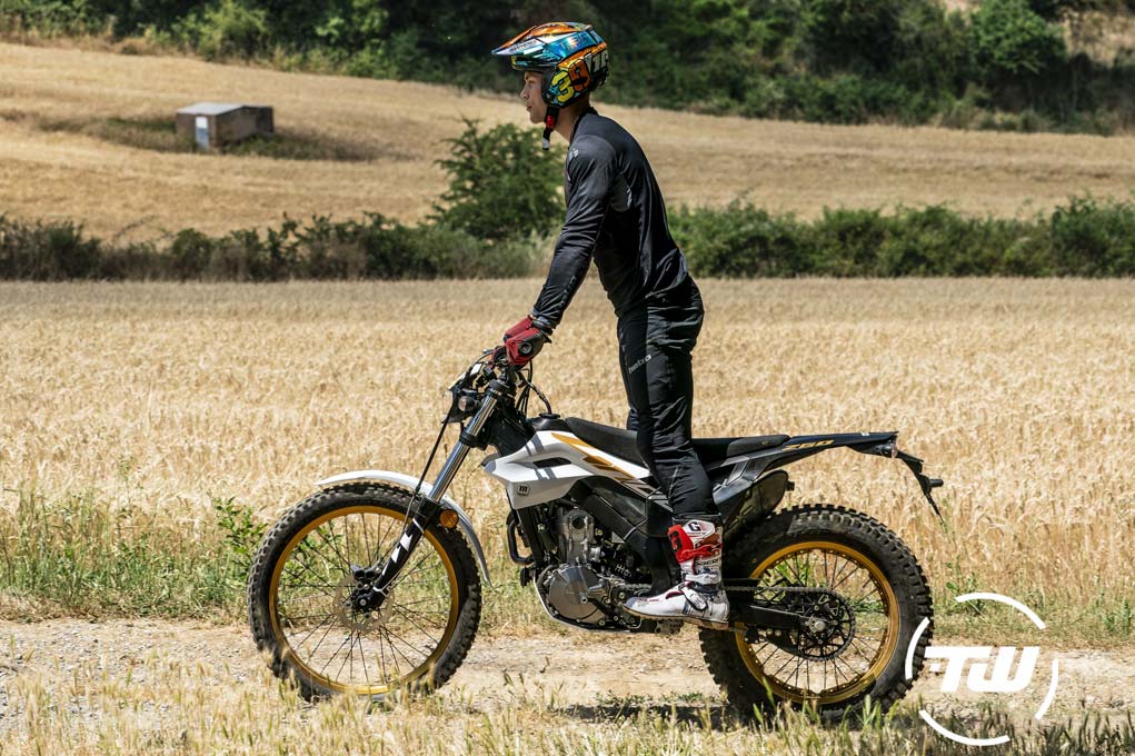 El chasis se construye en doble viga de aluminio, con dimensiones de 2.020 x 840 x 1.135 mm y una distancia entre ejes de 1.335 mm. Destaca su altura de asiento de 905 mm, claramente superior a las Cota de trial, lo que favorece la conducción tipo enduro-trail. El depósito aumenta hasta 4,3 litros, ampliando notablemente la autonomía en comparación con las versiones puramente trialeras.