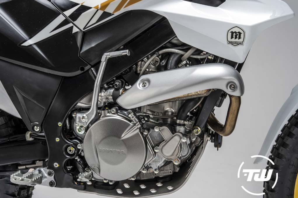 El motor mantiene la esencia Montesa-Honda: un monocilíndrico de 4 tiempos, 4 válvulas, SOHC y refrigeración líquida, con 258,9 cm³, relación de compresión de 10,5:1 y dimensiones internas de 78 x 54,2 mm. La alimentación está gestionada por inyección electrónica PGM-FI, garantizando una entrega suave y eficaz en todo el rango de uso.