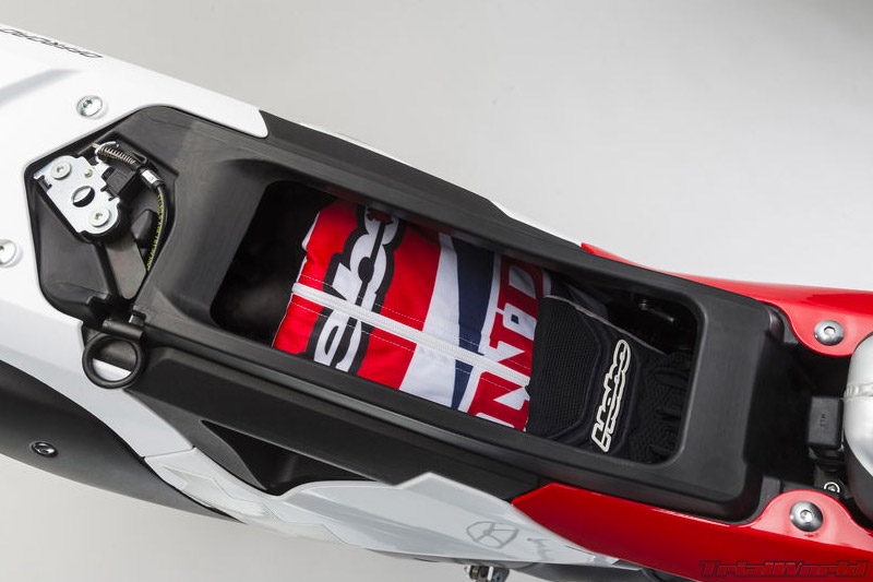 Lo primero que llama a la vista es la carrocería. Toda la parte trasera se ha rediseñado para recibir un nuevo subchasis y asiento que se sitúa a una altura de 885mm, óptima para cualquier talla de piloto. El asiento es fácilmente desmontable con un práctico tirador, dando acceso a una interesante cavidad interior donde se pueden alojar objetos personales, herramientas o un bidón con combustible adicional.