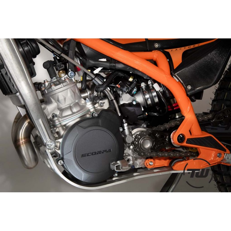 Das SCORPA SC 300 2025 verfügt über ein Hybrid-Startsystem, bei dem der Kickstarter durch eine Zusatzbatterie ergänzt wird, die sich selbständig auflädt und eine konstante elektrische Spannung für das Motorrad gewährleistet.