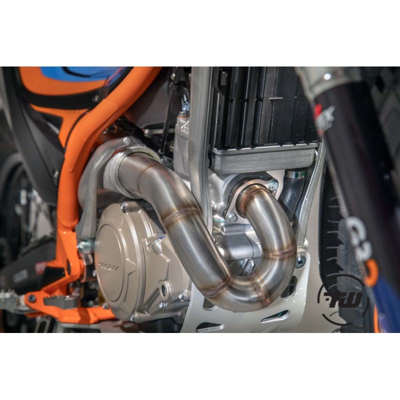Neuer Auspuffkrümmer bei den 250 und 300 ccm, der das Bremsen des Motors reduziert