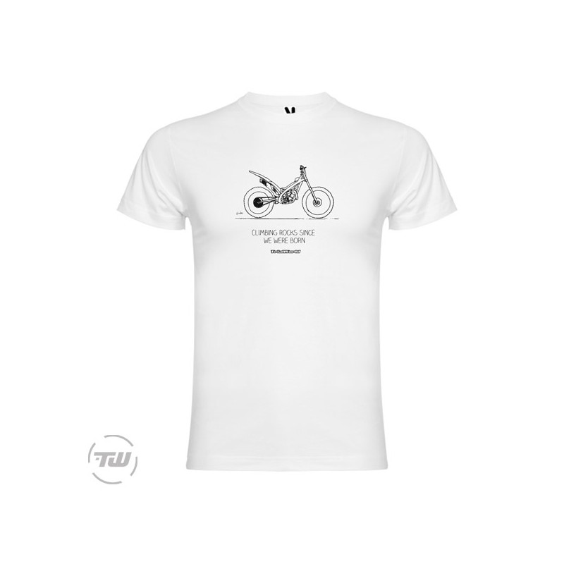 The best-selling trialcasual t-shirt is back in stock with a 2025 update. Made with high quality 100% cotton (70% organic and 30% recycled) and a classic unisex cut, it is printed with a handmade motorcycle design from trialand the mythical phrase we have been using since 2019: Climbing Rocks since we were born.