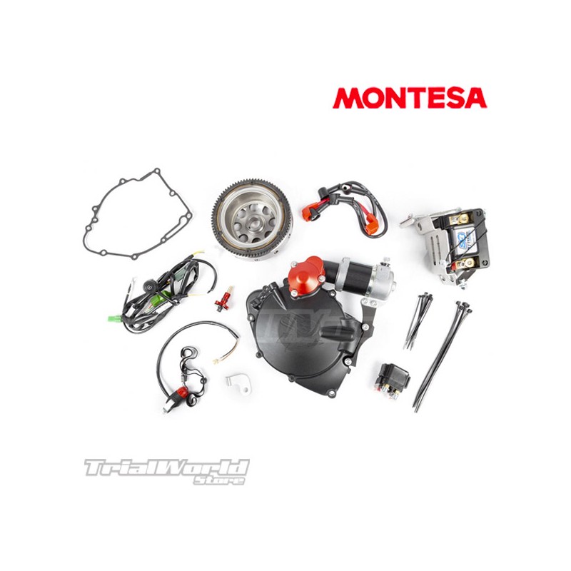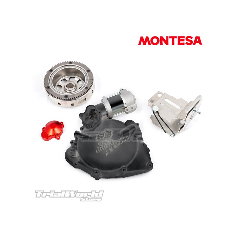 Compatible spare part MONTESA - HONDA Electric starter kit S3 Parts MONTESA COTA 4RT (all) Electric starter kit S3 Parts MONTESA COTA 300RR (all) Electric starter kit S3 Parts MONTESA COTA 301RR (all) The electric starter kit contains: Ignition flywheel (original + ring gear) Starter motor cover with Bendix and pions Electric circuit, prepared for connection to the original system with only one connector, includes starter button and stop-engine.
