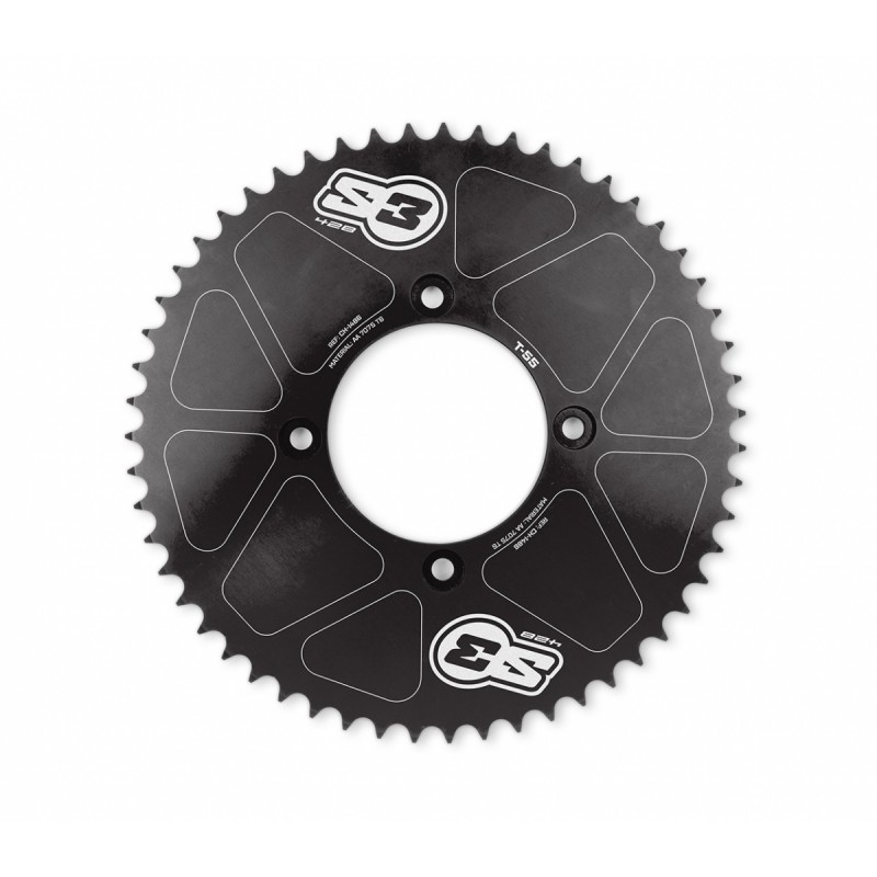 Corona trasera de transmisión negra S3 Parts homologada para Electric Motion EPure y Electric Motion Escape. Corona compatible con cadenas con paso de 428. Elegir la combinación en el desplegable.