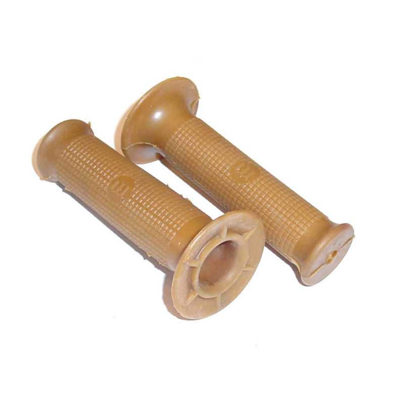 Poignées de guidon Montesa Cota originales en marron, respectant les motifs, les matériaux et l'esthétique des originaux de l'époque.