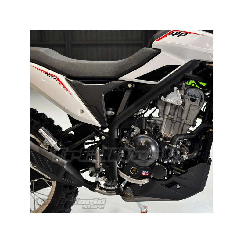 Châssis. Le châssis du nouvel ALP est un châssis périmétrique en acier avec moteur suspendu et finition noire. Il garantit la robustesse et la maniabilité du véhicule, grâce aux dimensions du châssis déterminées par les techniciens de Betamotor, qui travaillent en parfaite synergie avec les suspensions.