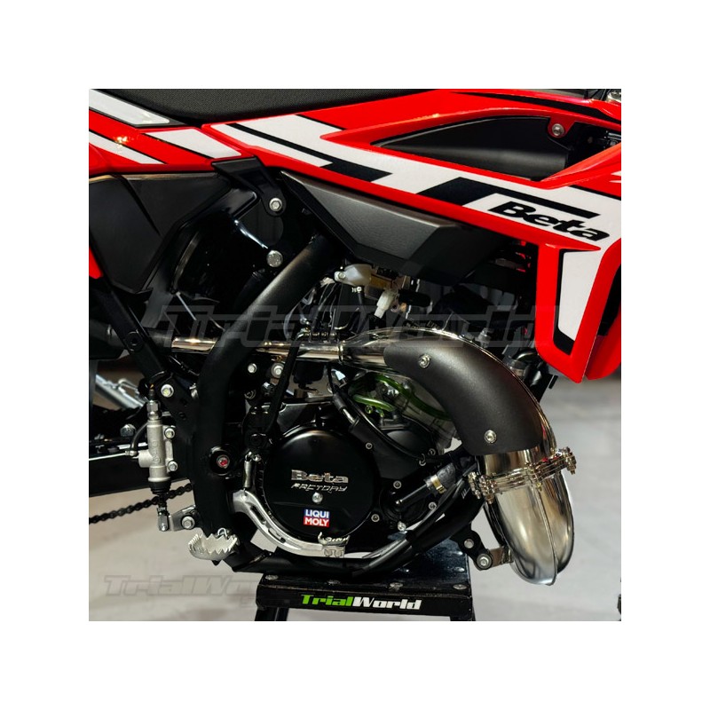 - Limiteur complet (non fourni). La moto a un bouchon supplémentaire sur le silencieux d'échappement et le seul moyen est de remplacer soit le silencieux entier, soit la première section. Cette pièce est disponible dans le TRIALWORLD STORE, est fournie par BETA et maintient la garantie sur la moto.