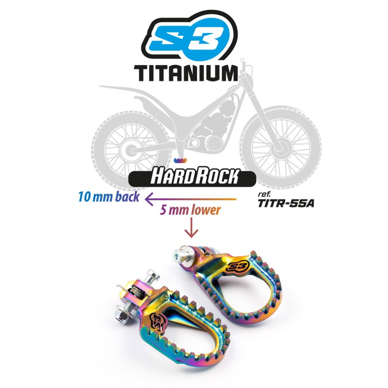 Pedane universali S3 Hardrock Titanium per moto trial. Realizzate in titanio, leggerissime e lavorate a dente di sega per la massima aderenza. Modificando la posizione delle rondelle (incluse) è possibile arretrare la posizione di guida di 10 mm e abbassare il baricentro di 5 mm, migliorando la trazione e l'equilibrio sulla moto. Il riferimento di questo prodotto è TITR-55