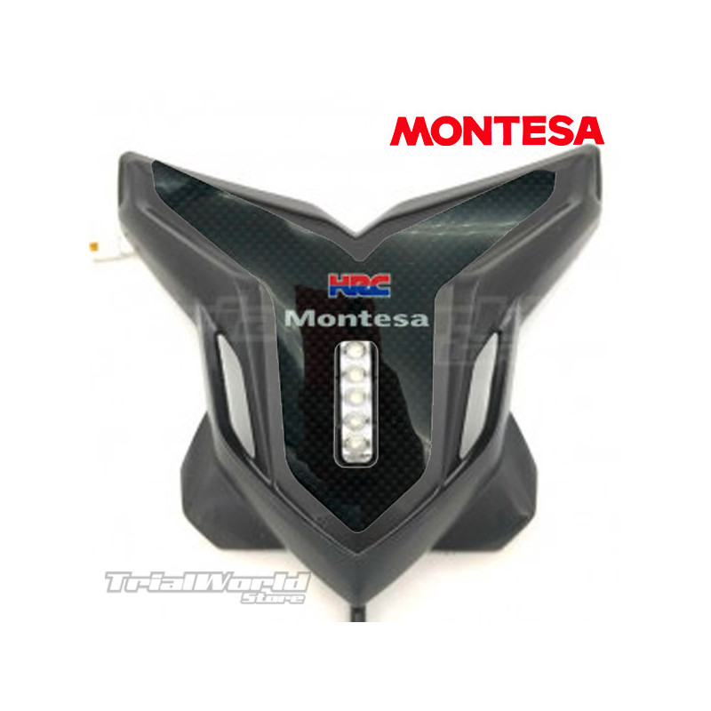 Faro universale per qualsiasi moto da trial. Colore nero. Aggiunge un adesivo per il faro con finitura in carbonio e logo Montesa e HRC. Dà un aspetto molto più racing. Il riferimento di questo prodotto è FAROMONTESANEGRO