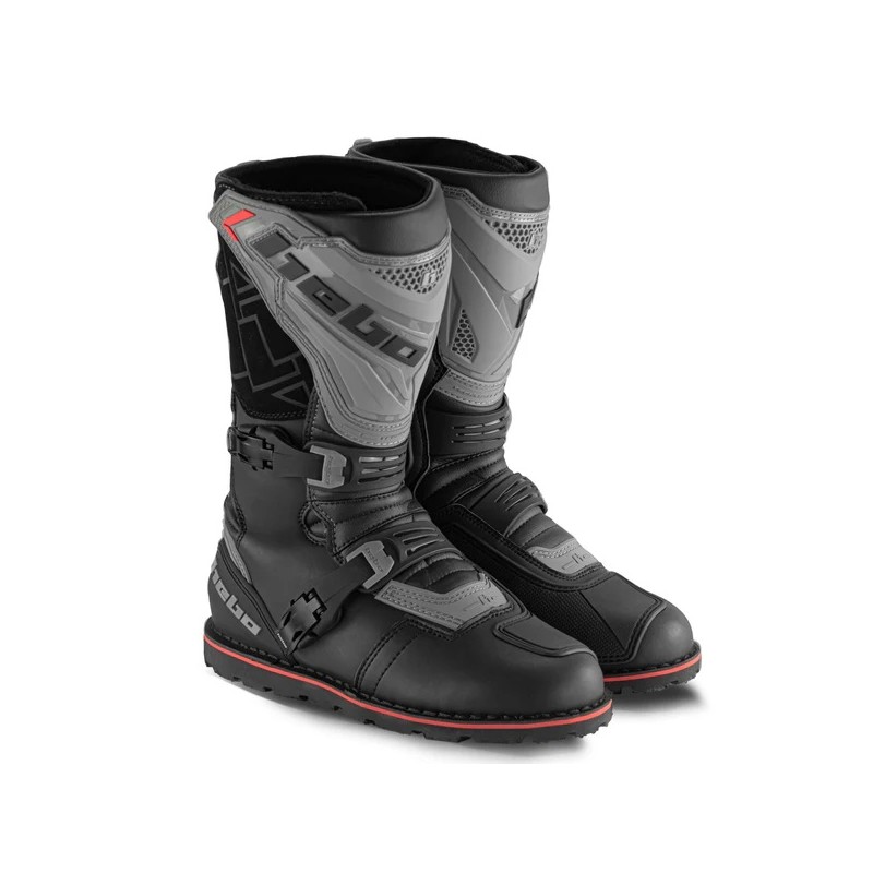 Nuovi stivali di trial HEBOTECHNICAL 3.0 MICRO in colore nero, realizzati in microfibra di alta qualità. Stivali ridisegnati con la forma preinclinata in avanti, protezione in punta, tallone, stinco e interno della caviglia. Zip microregolabile e rinforzo interno per evitare l'ingresso di acqua. Suola ridisegnata con una composizione più resistente e durevole sulla superficie di appoggio del plantare.